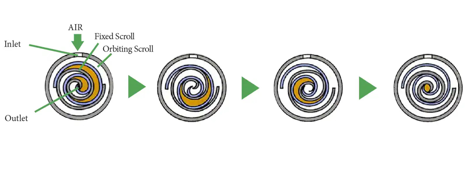 Este sistema genera una compresión progresiva y continua del aire a través de la reducción de volumen en las cámaras espirales, sin necesidad de lubricación con aceite.